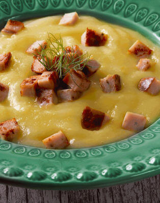 - Cozinhar por 15 minutos as batatas descascadas e a erva doce em 500ml de água com sal e pimenta do reino